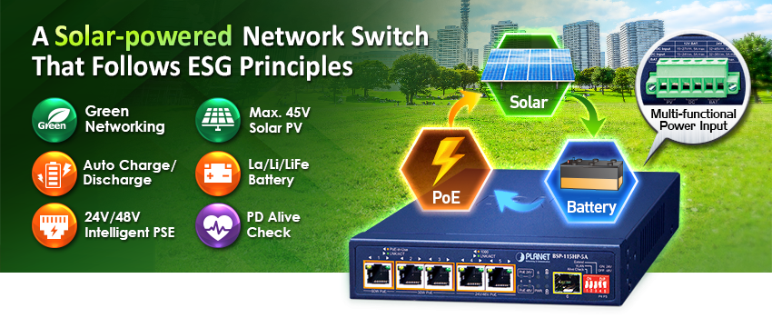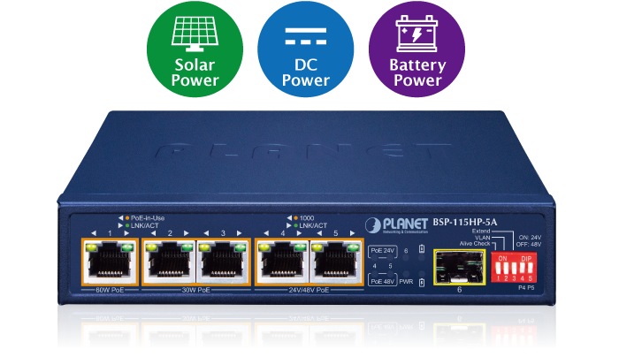 El conmutador PoE solar PLANET BSP-115HP-5A es un conmutador de red alimentado por energía solar que incorpora principios ambientales, sociales y de gobernanza (ESG). Se puede cargar con fuentes de energía naturales e inagotables, como la solar, la eólica y la hidroeléctrica, para conservar energía y alimentar de manera económica estas cámaras IP remotas y puntos de acceso inalámbricos. El BSP-115HP-5A está equipado con 5 puertos de cobre 10/100/1000BASE-T. El puerto 1 admite PoE de 60 vatios y los puertos 2 a 5 admiten la función de inyector PoE+ 802.3at. Además, los puertos 4 a 5 también ofrecen opciones pasivas de 24 V/48 V. El uso de equipos PoE de 24 V mejorará la eficiencia energética. Cuando se alimenta con una batería de 24 V, no es necesario sufrir la pérdida de elevación. Un presupuesto total de energía PoE de hasta 65 vatios y un puerto de fibra SFP 100/1000BASE-X adicional se utilizan especialmente para aplicaciones tan amplias como represas, bosques, desiertos, parques nacionales, áreas de protección de la naturaleza/animales y autopistas.