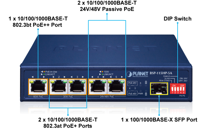 Con esta nueva característica, el BSP-115HP-5A proporciona una solución adicional para la extensión de la distancia PoE+ 802.3at, ahorrando así el costo de la instalación del cable Ethernet.