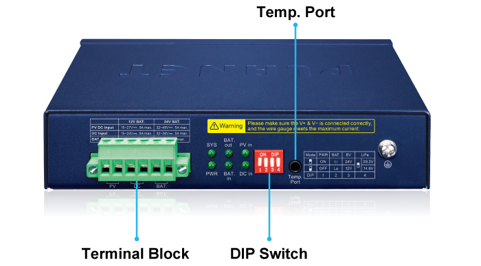 La serie BSP-115 está equipada con un sensor de temperatura para protección de la batería. Cuando el sensor detecta que la temperatura de la batería supera los 70~75 grados C, la fuente de alimentación de alta corriente PoE se detendrá para enfriar y proteger la batería.