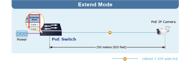 • En el modo de operación "Extender", el BSP-115HP-5A funciona por puerto a una velocidad de funcionamiento dúplex de 10 Mbps, pero admite una salida de potencia PoE de 25 vatios a una distancia de hasta 250 metros, superando el límite de 100 m del cable UTP Ethernet.