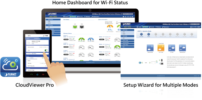 A través de la aplicación PLANET CloudViewerPro o la aplicación NMSViewerPro (necesaria para NMS-500/NMS-1000V), los puntos de acceso se pueden monitorear y controlar en tiempo real sin una ubicación específica ni una limitación de tiempo. El nuevo asistente de configuración de GUI ayuda al administrador del sistema a configurar fácilmente el WDAP-W3000AX paso a paso. Además, el analizador de Wi-Fi integrado proporciona la utilización del canal en tiempo real para evitar la superposición de canales y garantizar un mayor rendimiento. Gracias al mecanismo de transmisión automática de potencia, el control de distancia y la configuración de reinicio programado, el administrador puede implementar y administrar fácilmente el WDAP-W3000AX sin necesidad de mantenimiento en el sitio. Además, la función de control de AP PLANET NMS-500 o NMS-1000V se puede utilizar para enviar perfiles inalámbricos a varios AP simultáneamente, lo que simplifica la administración central.